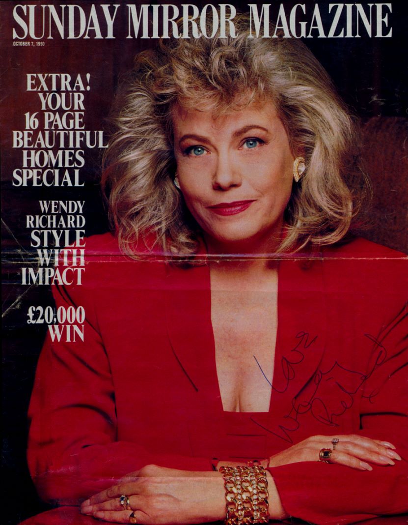 Cover girl Wendy! From the Sunday supplement of the Mirror newspaper, October of 1990. An improvment over the previous version shown here: some fold lines and scuff marks have been removed; however, regretably, much wear is still evident. On the bright side, it was signed by Wendy! Note that this is from the same shoot as the Radio Times issue of the same year. |